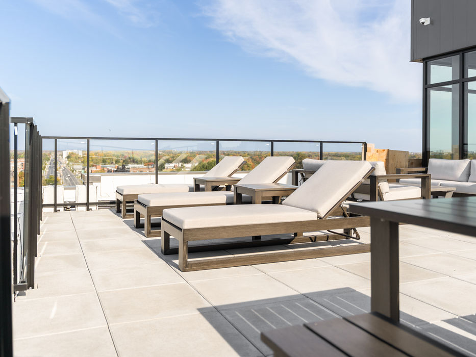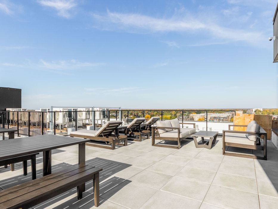 Le sommet de l'immeuble offre une magnifique terrasse sur le toit. Cet espace privilégié possède une vue dégagée et est entièrement aménagé pour le plaisir des occupants. On y trouve des chaises longues pour la détente au soleil, ainsi que des tables et un BBQ pour les repas en plein air.